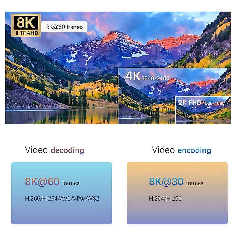 ● 8 কে ভিডিও এনকোডিং এবং ডিকোডিং, 8 কে ডিসপ্লে আউটপুট